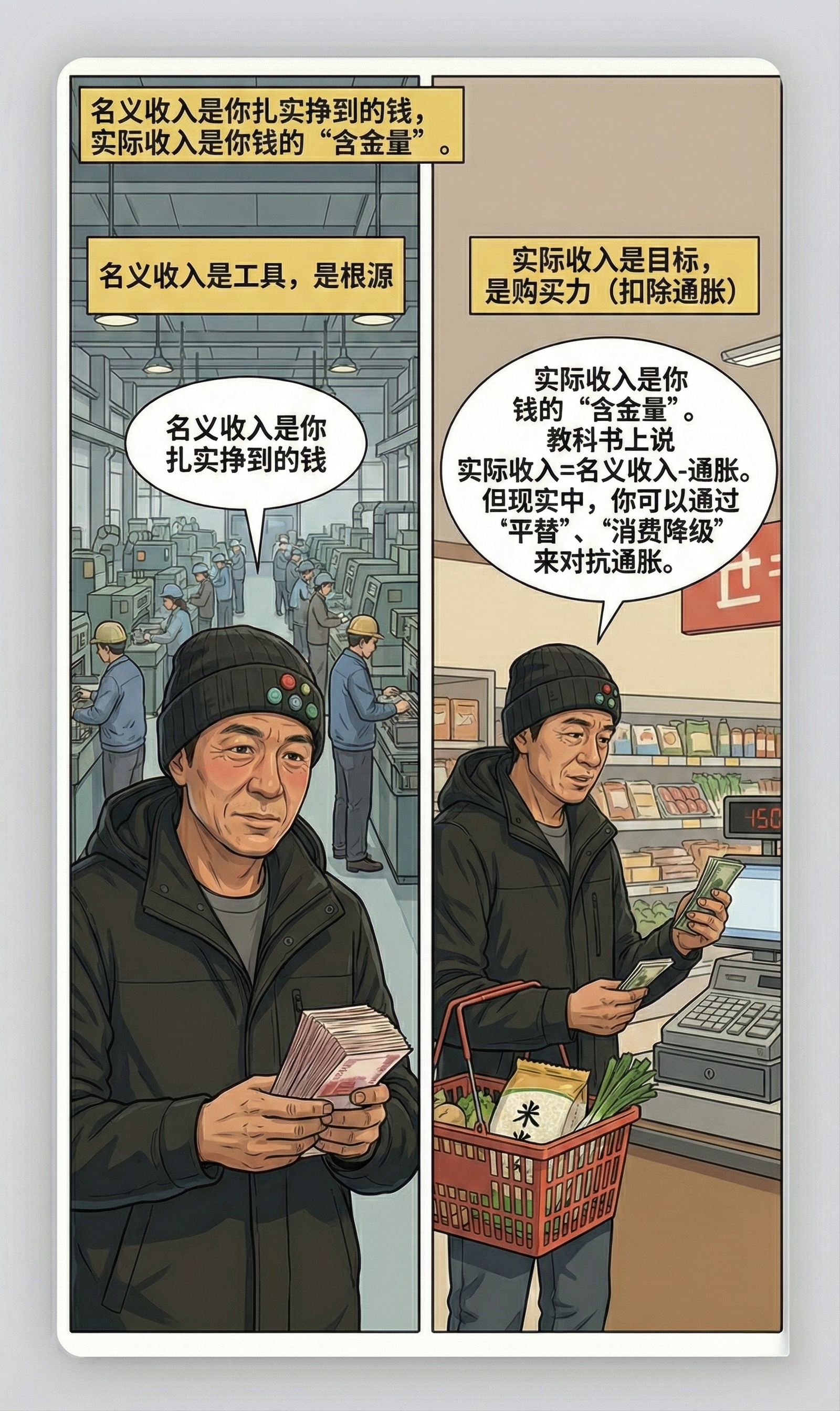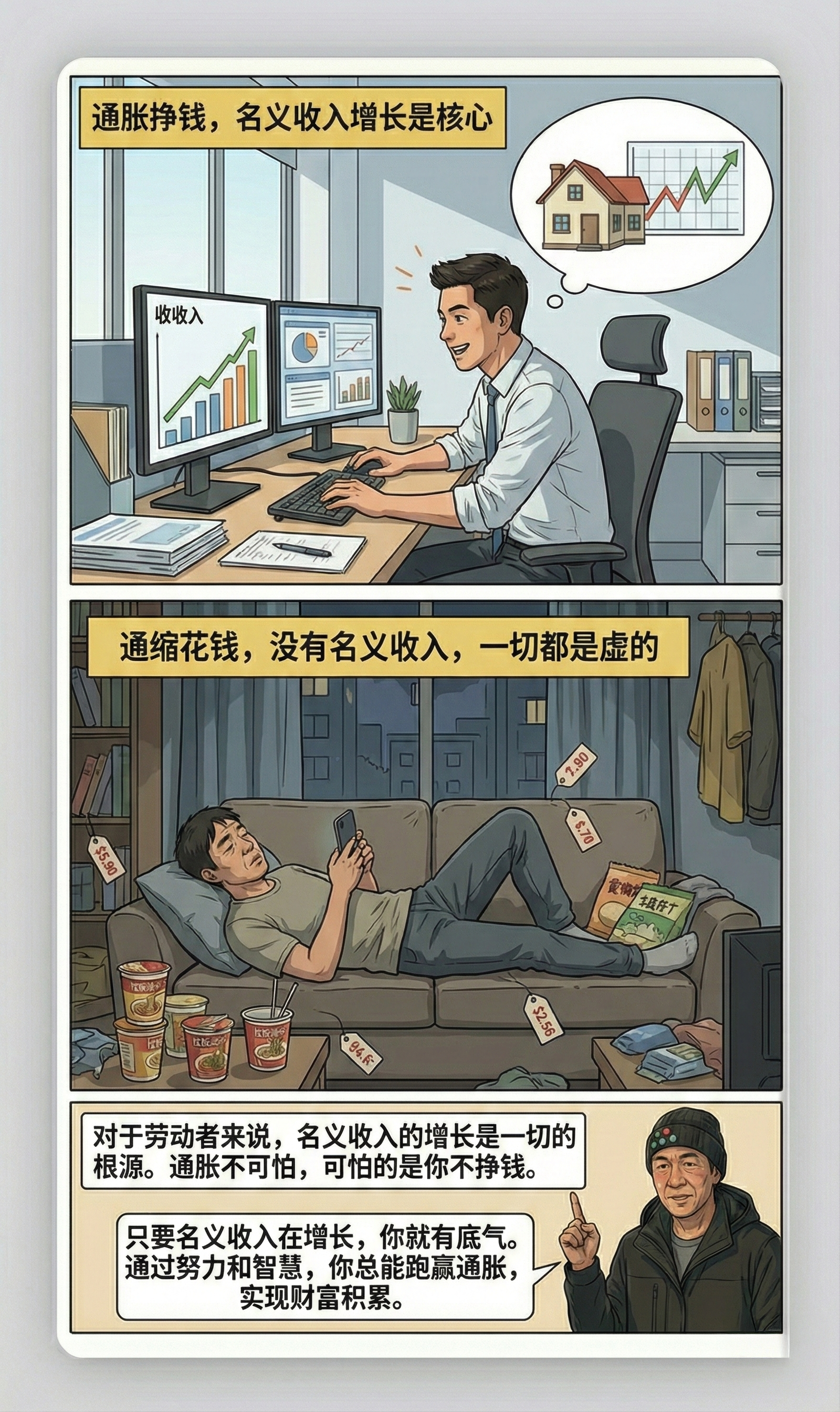 本期内容主要探讨了名义收入和实际收入的概念差异及其实际影响。核心观点是名义收入(到手薪资)是基础工具,实际收入(扣除通胀后的购买力)是目标,强调名义收入增长对劳动者的重要性。会议指出通胀环境下名义收入增长能带来借贷和投资机会,而通缩则导致收入停滞或下降;实际收入的统计存在偏差,因消费习惯、地区差异和福利保障等因素会影响实际购买力;不同群体对通胀的感受差异大,有收入增长者可通过调整消费方式应对通胀,而无收入增长者则更易受通胀侵蚀。总结认为应优先关注名义收入增长,实际收入的实现可通过多种个人方式调整。