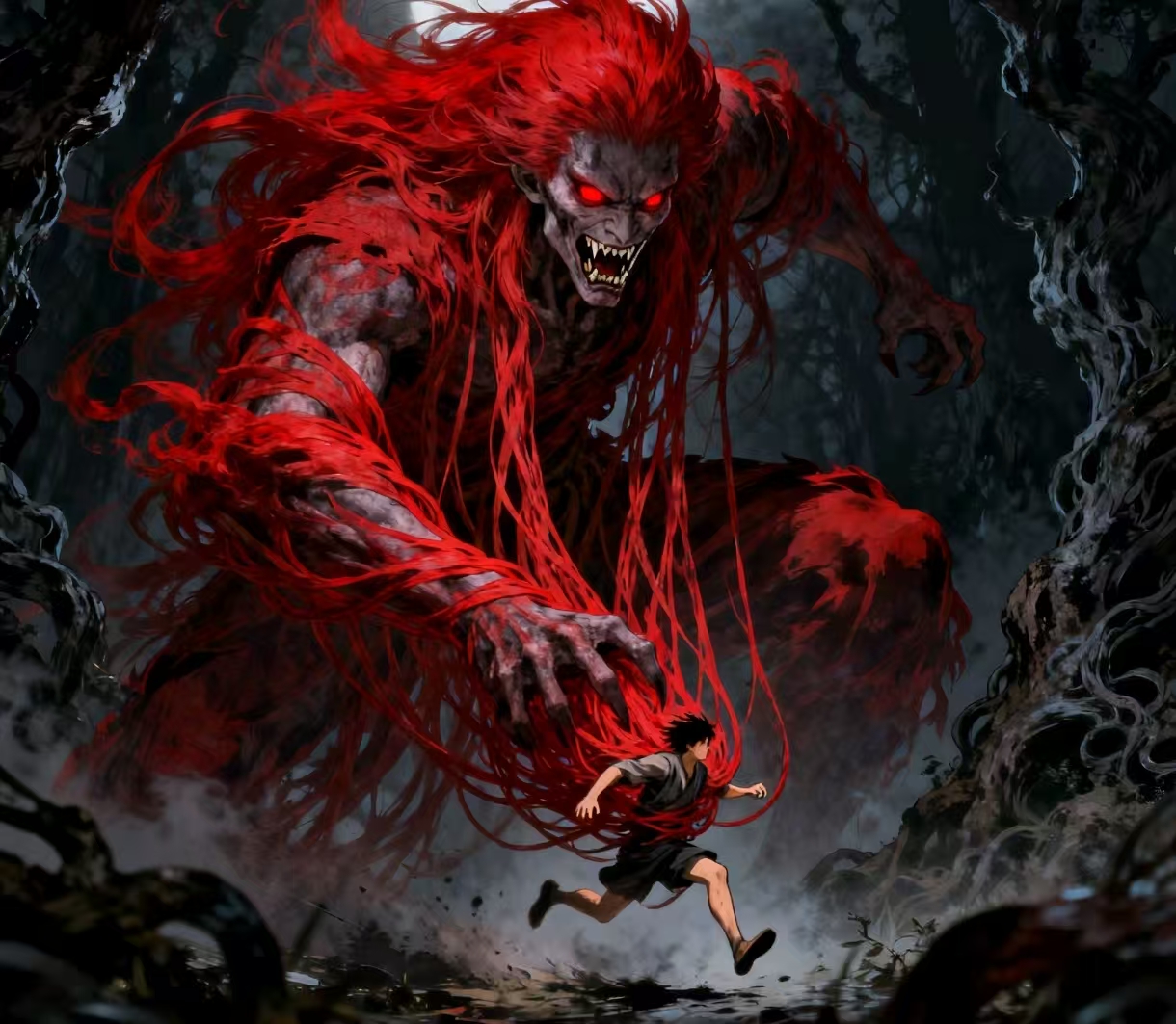 电影中的赤发鬼从屏幕中走出来,用头发把眼前的赤脚怪一点一点吞噬...