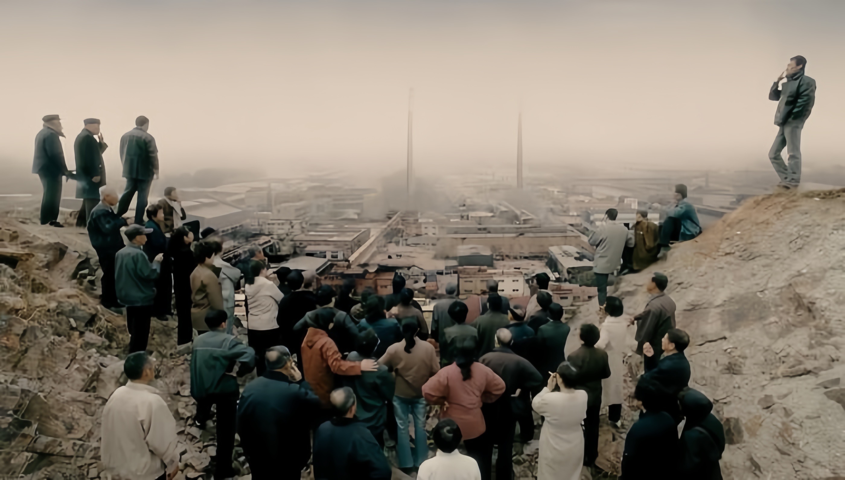 下岗工人看工厂爆破烟囱(图片来源:电影《钢的琴》)