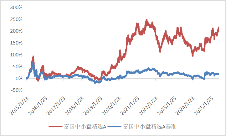 数据来源:富国中小盘精选A的净值和业绩比较基准走势图来自基金定期报告,截至2025/6/30。最新的基金净值、基金净值增长率及同期业绩比较基准收益率数据来源于富国基金,截至2025年9月22日,以上各区间的基金净值增长率和业绩比较基准收益率已经经托管人复核,基金收益率不代表投资者实际收益率,基金份额净值仅为每份额基金产品的净资产。富国中小盘精选混合A/B成立于2015/01/23,业绩比较基准为中证700指数收益率“80%+中债综合财富指数收益率*20%。近5个完整年度(2020-2024)的基金份额净值增长率(及同期业绩比较基准收益率)为83.69%(23.06%).8.91%(9.53%),-21.92%(-17%).-5.06%(-5.28%),10.11%(8.62%),数据来自基金定期报告,截至2024/12/31。期间基金经理变动情况:曹晋(2015/01/23至今)。基金收益率不代表投资者实际收益率,基金份额净值仅为每份额基金产品的净资产。基金历史业绩不构成对未来业绩的保证。