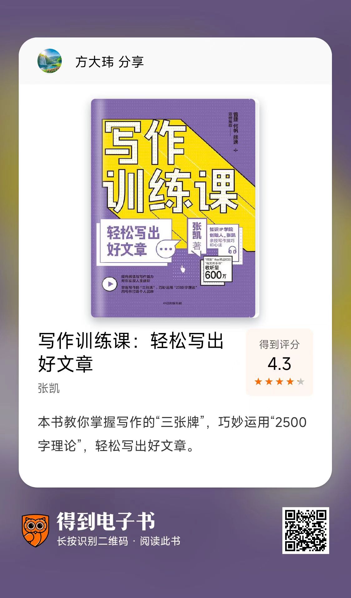 张凯老师,累计解读100+本书【听书解读人:张凯】,收听量1500万次,课程销量突破10万份。离开得到后,他成为全职讲师,授课内容涵盖快速阅读、写作训练、AI办公效率、AI赋能家庭教育、公文写作等领域。出版过《写作训练课》,举办签售遍及十余城市。