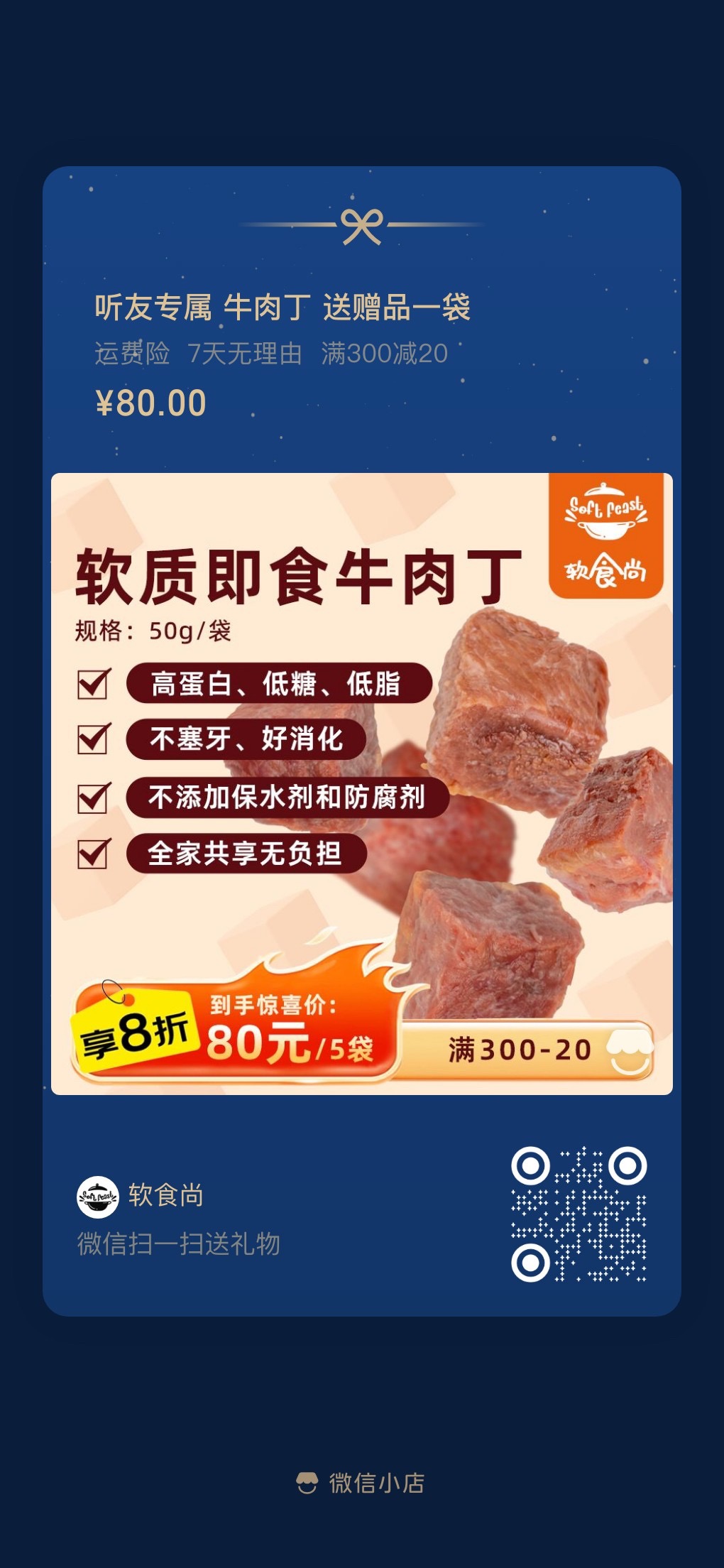 新品「软食尚」软质牛肉丁“满300-20”优惠还剩一周,大家有需要的抓紧扫码下单啦~听友扫码还有额外加赠优惠哟~