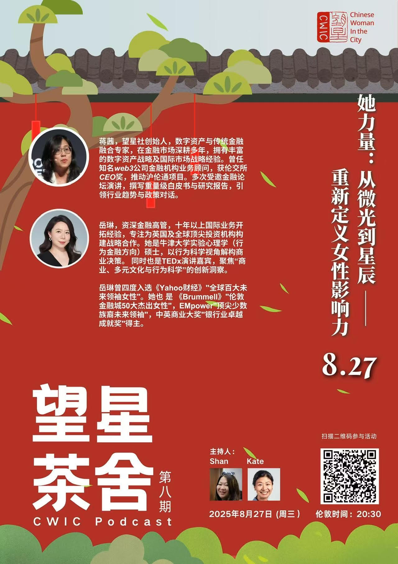 望星社(CWIC)是由一群供职于世界顶尖金融机构的华人女性在伦敦创立。我们为在金融、技术、咨询等专业服务领域就职的海内外华人女性提供一个共同探索、交流、互助的平台。给所有独立思考,心中有海,眼里盛星的职业女性一个温暖、坚实的拥抱。
