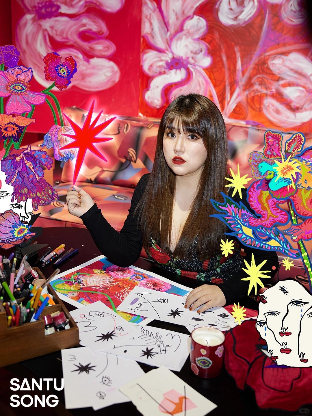 她的视觉体系由三个核心符号构成:眼睛、花朵与光。