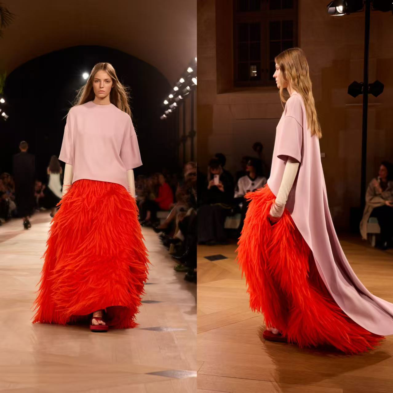 28:01 LOOK19 1967年极简一片式婚纱廓形的粉色上衣与欧根纱刺绣红裙