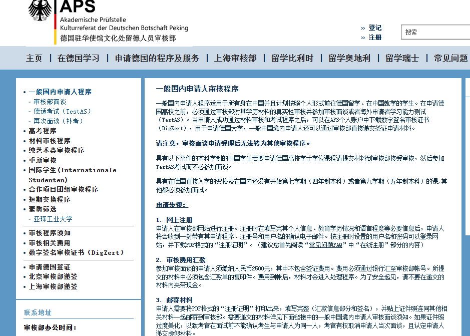 1. APS 审核:APS = Akademische Prüfstelle(德国驻华使馆文化处学历审核)