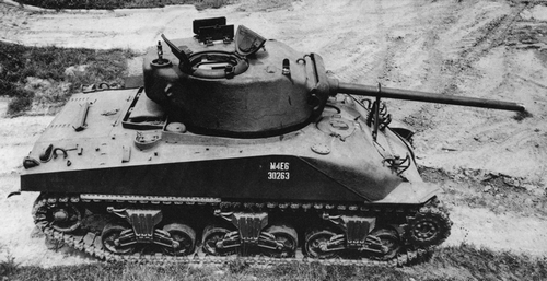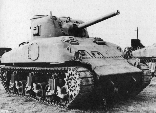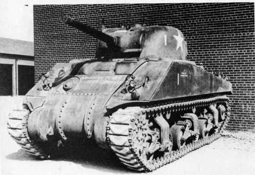 一辆正在接受第七装甲师评估的M4A1(76M1)中型坦克。照片显示了其火炮指向前方和后方被行军锁固定的姿态。注意炮塔上为7.62毫米高射机枪准备的特殊行军锁,以及为平衡76毫米火炮的重量而在炮塔尾部附加的外延凸架