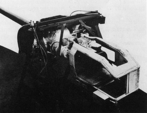 安装在M34A1 型并列炮座上的M1型76毫米火炮。注意焊接在火炮后坐挡板上用于平衡长炮管重量的配重