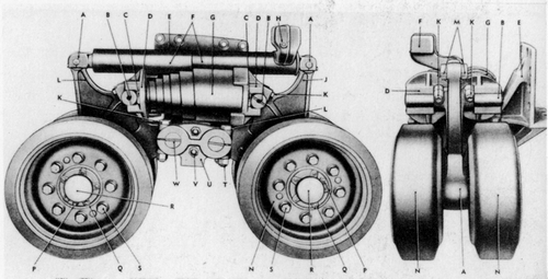 谢尔曼坦克的后期量产型垂直涡卷弹簧悬挂装置轮轴架三视图,这种重载轮轴架设有回转式履带滑材