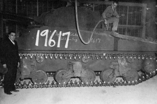 这辆M4A4刚完成早期型水平涡卷弹簧悬挂装置的安装工作。可以清楚地看到车体每侧第1和第3轮轴架上的减震器
