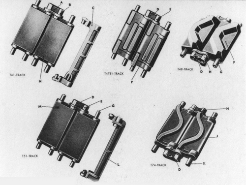 安装垂直涡卷弹簧悬挂装置的谢尔曼坦克所使用的各型全钢履带板细节。