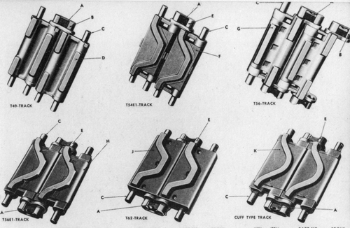 安装垂直涡卷弹簧悬挂装置的谢尔曼坦克所使用的各型挂胶履带板。