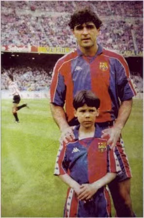 年幼的Rafa Nadal和效力于巴萨的叔叔Miguel Angel Nadal,当时穿着巴萨的球衣的小Rafa似乎一脸不情愿。