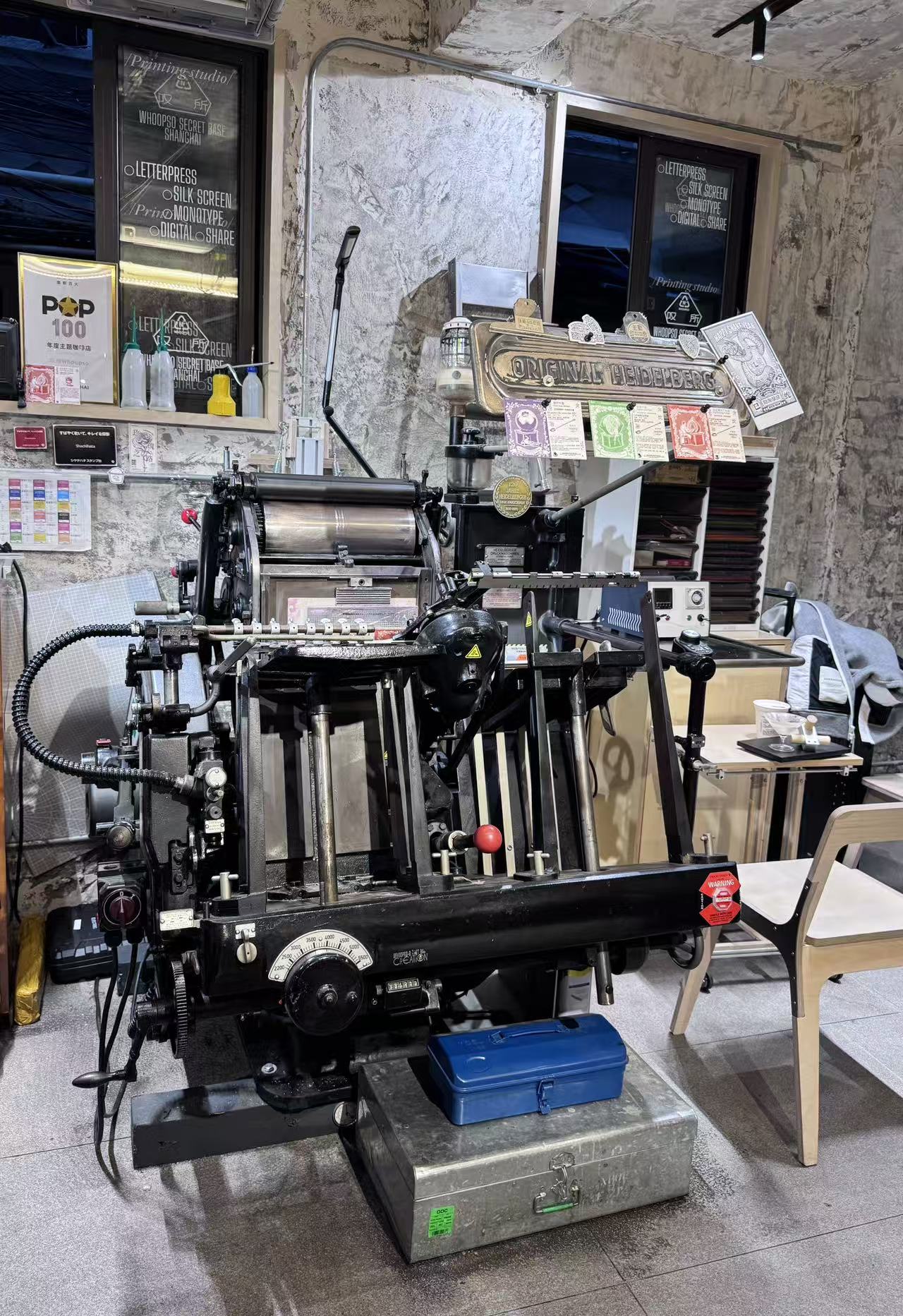 二手海德堡凸版印刷机放在店里,用于完成咖啡馆所有和顾客沟通的视觉印制。