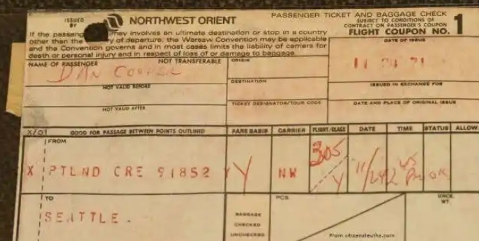 19:00,航班飞至俄勒冈卡斯卡德山脉上空,D.B. 库珀锁上驾驶舱门,提着赎金与降落伞走向尾部登机梯;19:20,机组听到登机梯放下声与风声,20 分钟后开门发现客舱空无一人,D.B. 库珀已跳伞逃生。机长紧急迫降里诺机场,FBI 在机上发现烟蒂(含 DNA)、指纹、备用降落伞,但未获关键身份线索。