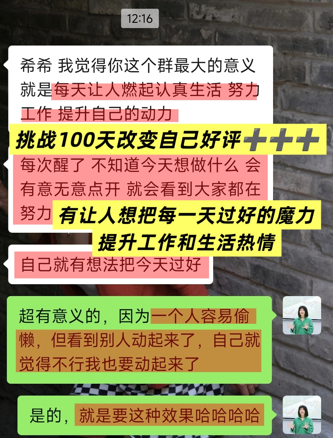 她说:“希希,我觉得你的群很有意义!每天都有让人燃起认真生活,努力工作,提升自己的动力,每次醒了不知道今天想做什么的时候就会有意无意点开,就会看到大家都在努力,自己就有想法把今天过好~”