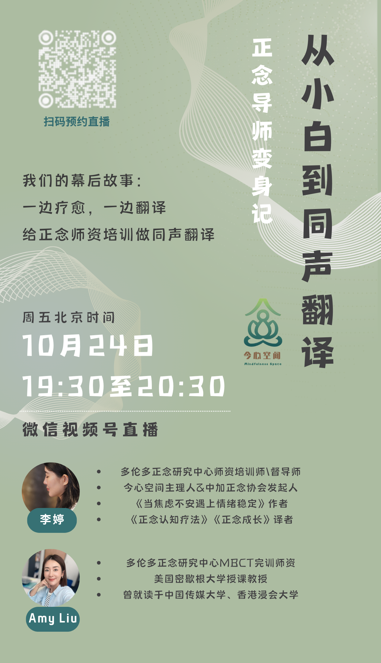 在本期播客中,今心空间主理人李婷Balinda连线美国密歇根大学任教的Amy Liu聊聊国际正念师资培训“幕后的故事”,分享了她们在正念学习和翻译过程中的奇妙经历。两位回顾了自2021年相识以来的成长之路,从默默的读书会听众到如今的翻译者,时间的流逝让她们感慨万千。Amy谈及为何选择中文正念课程,并表达了在文化共鸣中的学习乐趣。节目中也探讨了翻译工作如何影响她们对正念的理解与实践,以及这种学习对生活的深远影响。