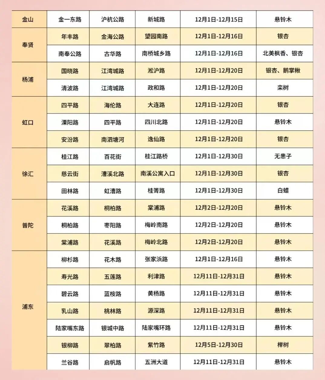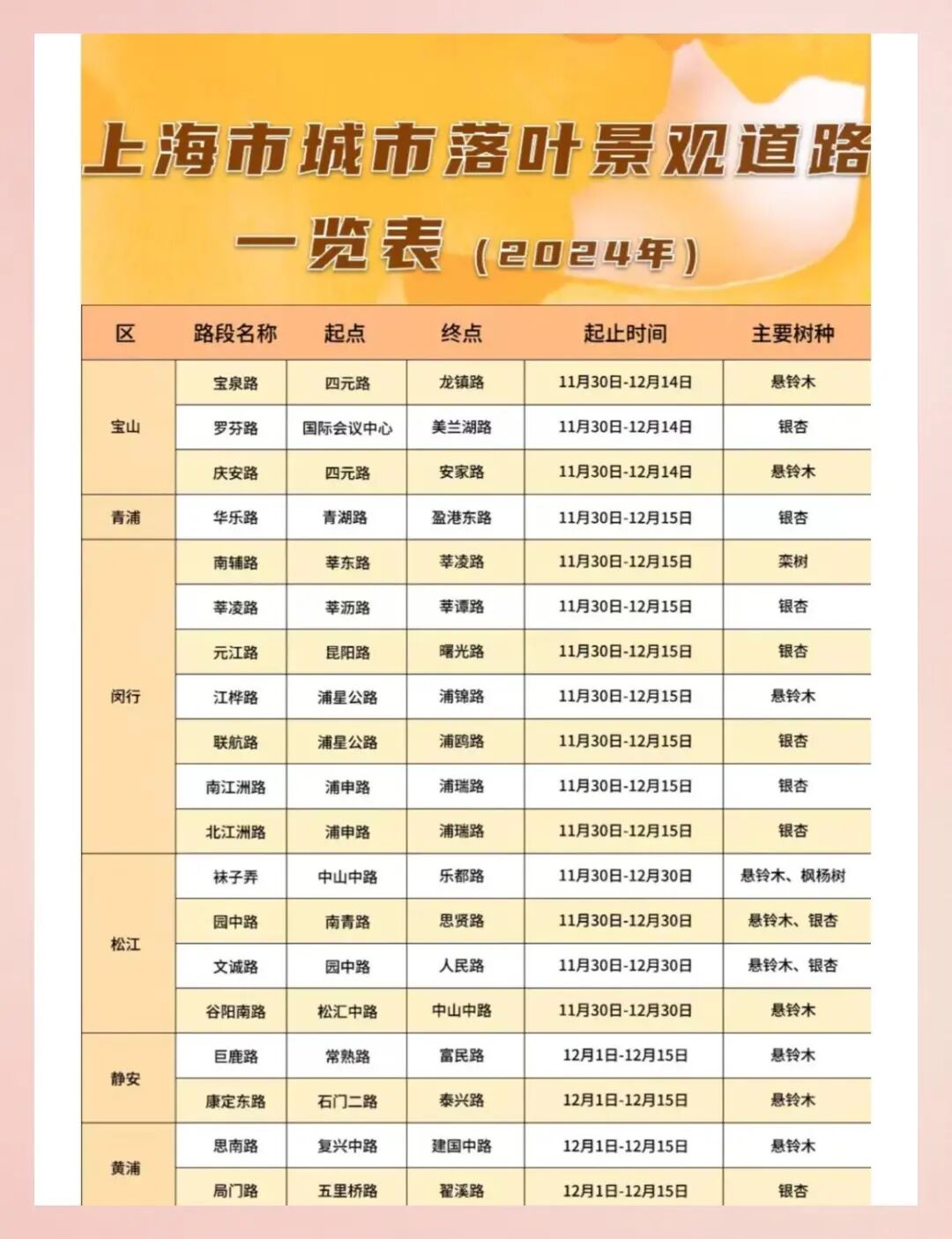 2019年全市推广后,上海落叶景观道路增至42条,覆盖12个区。2024年优化调整至46条。