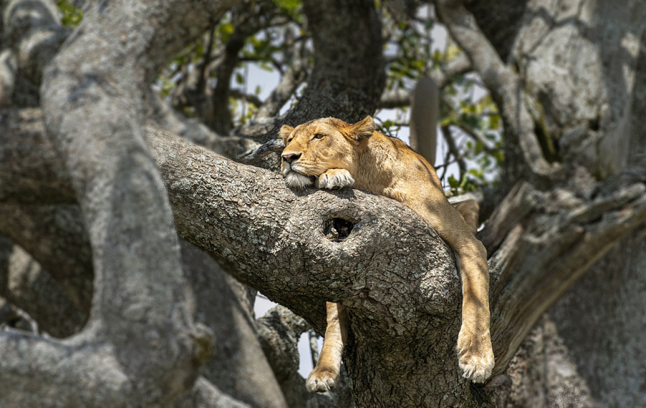 坦桑尼亚塞伦盖蒂国家公园,在树上打盹的非洲狮。视觉中国丨图