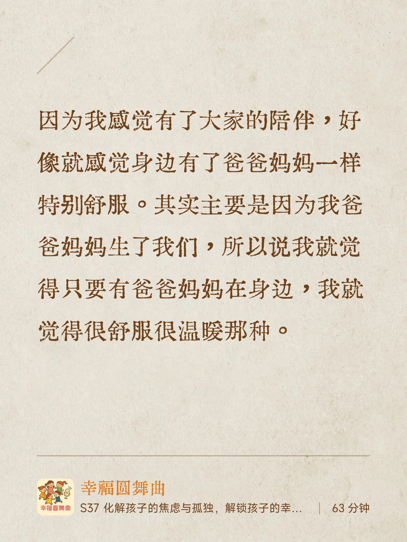 佑佑说特别喜欢咱们的这个节目,他说:因为我终于把我心底层面的些话都说了出来,因为单是这一个家庭不能把我所有想说的话都传递到很多人都能知道的地方。因为这样的话,其他孩子的爸爸妈妈们可能去有一些孩子,他可能会有一些焦虑,爸爸妈妈不知道为什么这样的话,爸爸妈妈也会知道可能是因为什么了。-- 他也说出来我们播客的意义,可以传递给更多的人!给更多人的人带来幸福!‘