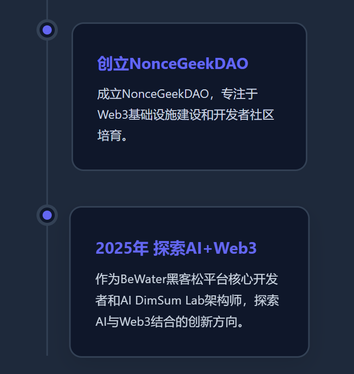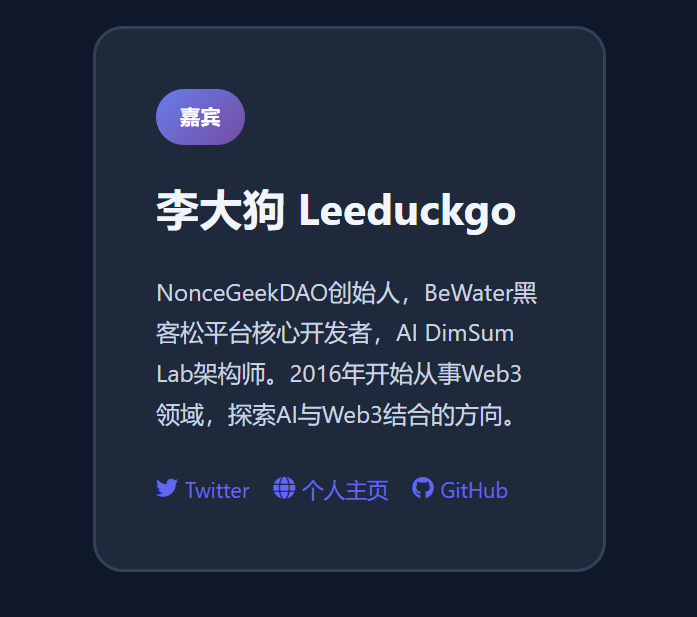 李大狗 | Leeduckgo,16 年开始从事 Web3 领域,NonceGeekDAO Founder,BeWater Hackathon Platform Core Dev,AI DimSum Lab 架构师,当前探索 AI 与 Web3 结合的方向。X:x.com;个人主页:leeduckgo.com;NonceGeekDAO 主页:github.com;BeWater 主页:bewater.pro。
