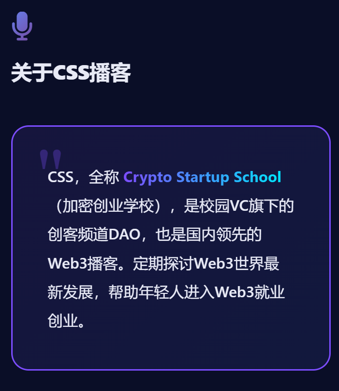 欢迎来到CSS,全称 Crypto Startup School(加密创业学校),是校园VC旗下的创客频道,也是国内领先的 Web3 播客。