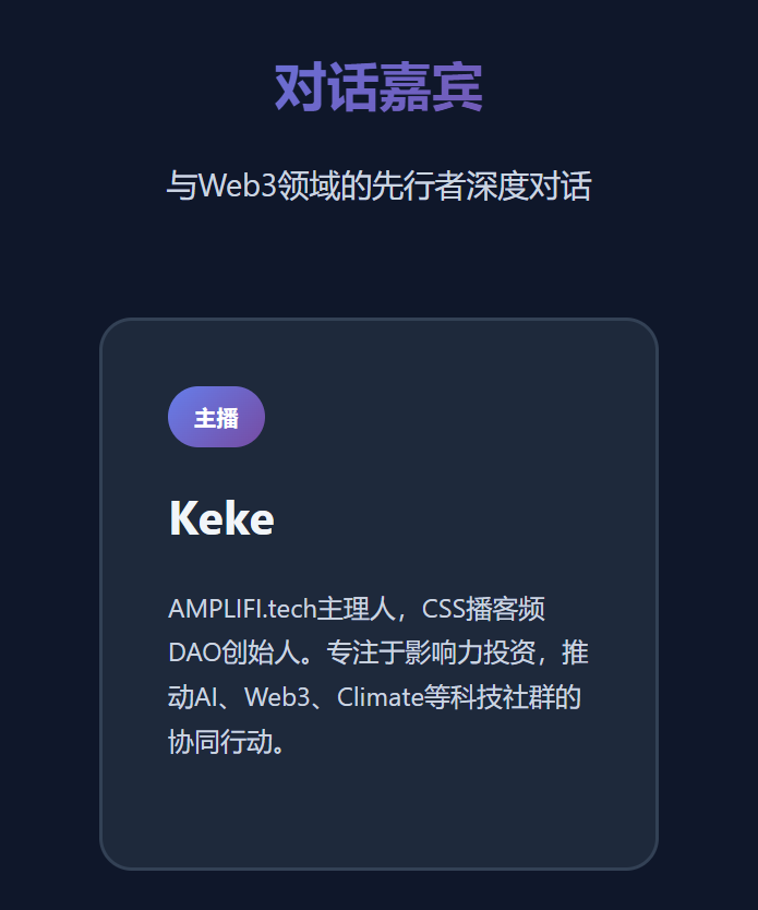 Keke | 主理 AMPLIFI.tech - 未来不打烊及 CSS 播客频道,从事影响力投资,经由播客故事的传播,持续推动 AI、Web3、Climate 等科技论社群的协同行动, 以及人类在永生科学中长寿以及意识进化的各项呼吁。联系:Keke