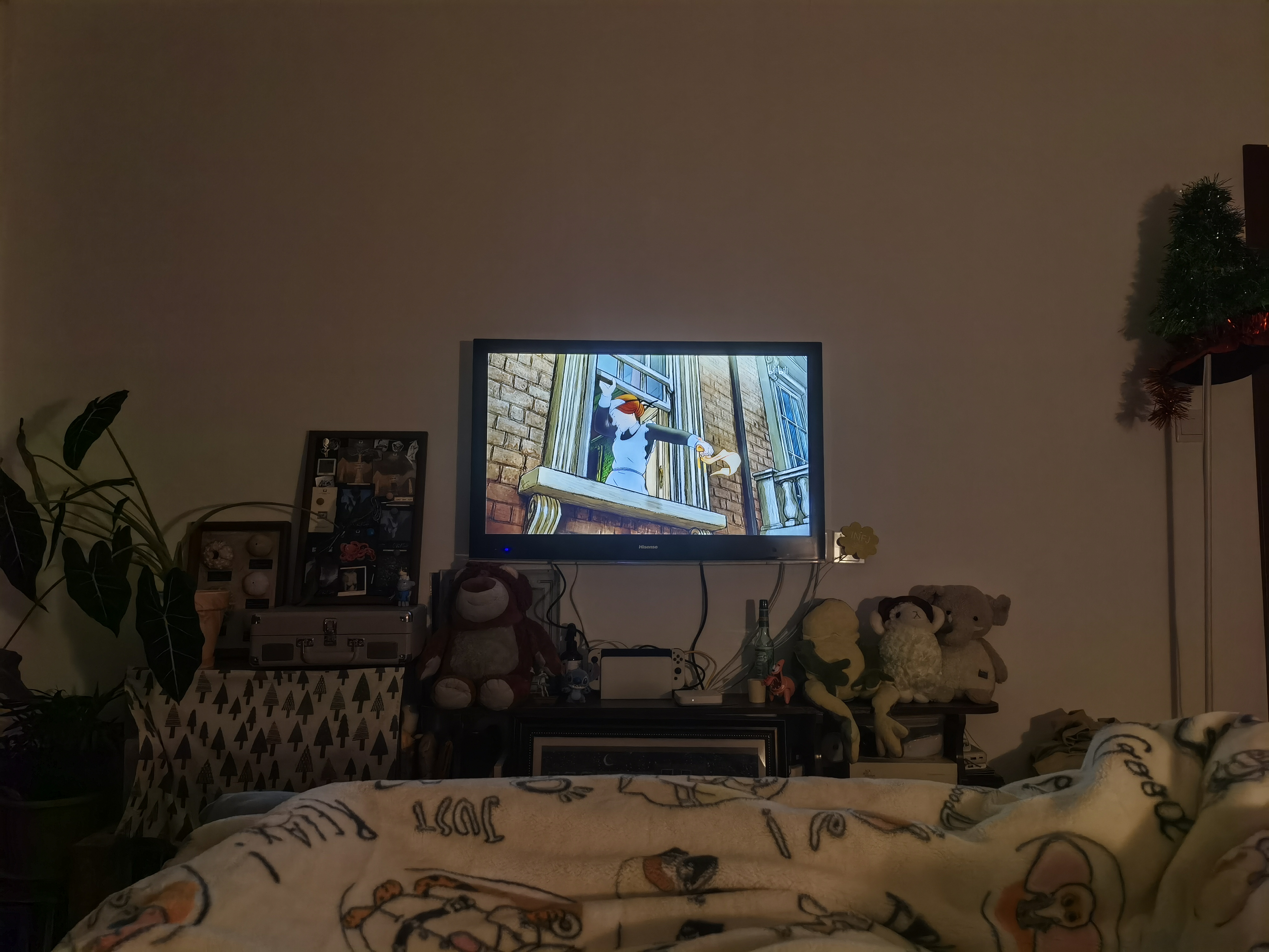 (冷天窝在被窝里看动画片的幸福感!感谢电视机、毛毯、玩偶、绿植肉肉......)