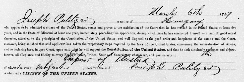 约瑟夫·普利策于1867年3月6日加入美国国籍