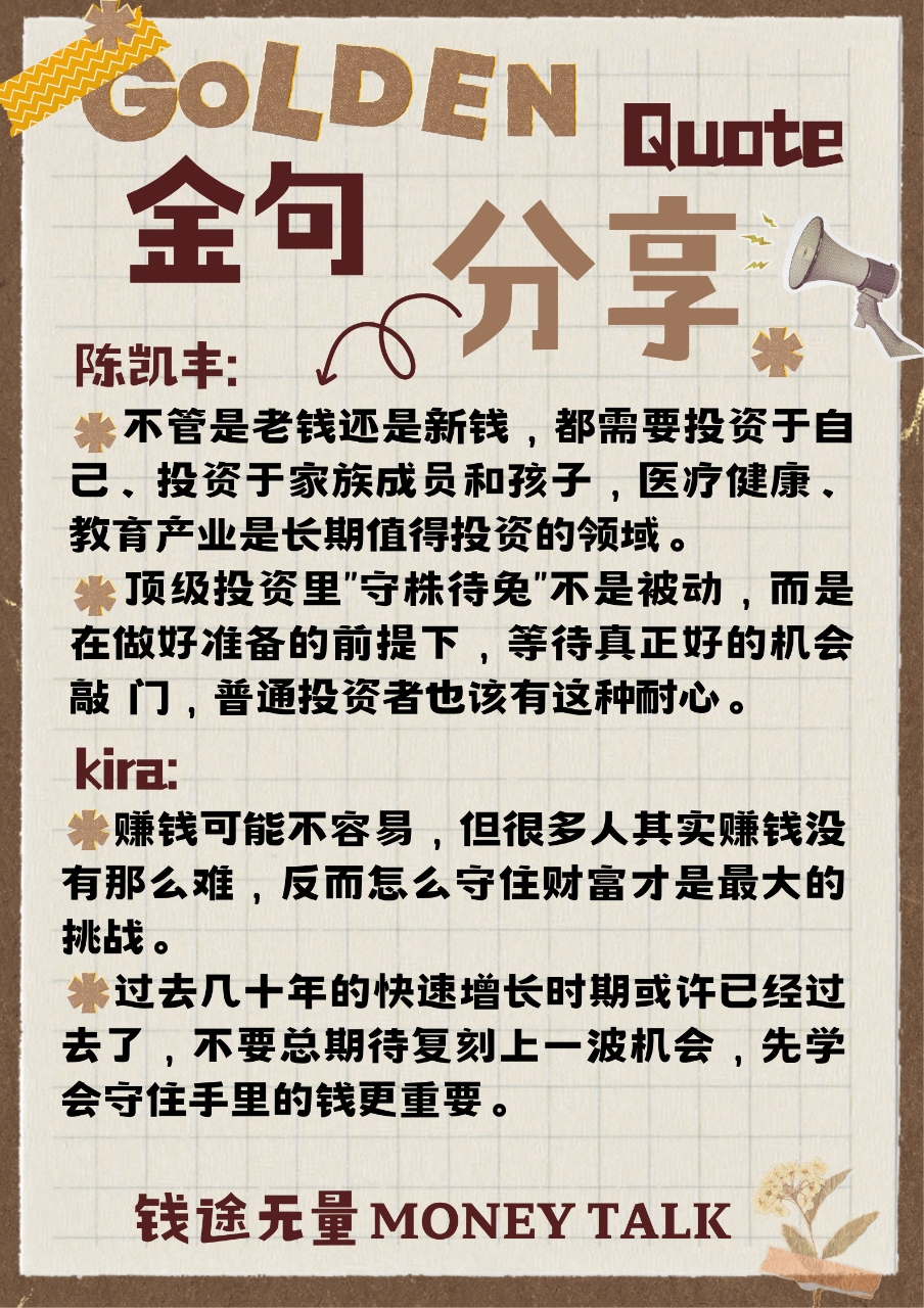 另外,陈教授还分享了服务顶级家族的经验:守住财富比赚钱难在哪?医疗、教育为什么是长期投资好赛道?家族传承要提前做哪些准备?正如巴菲特所言,“人一辈子富裕一次就够了”,而这份长久的安稳,藏在对风险的敬畏、对机会的耐心,以及对自我与传承的长远考量里。