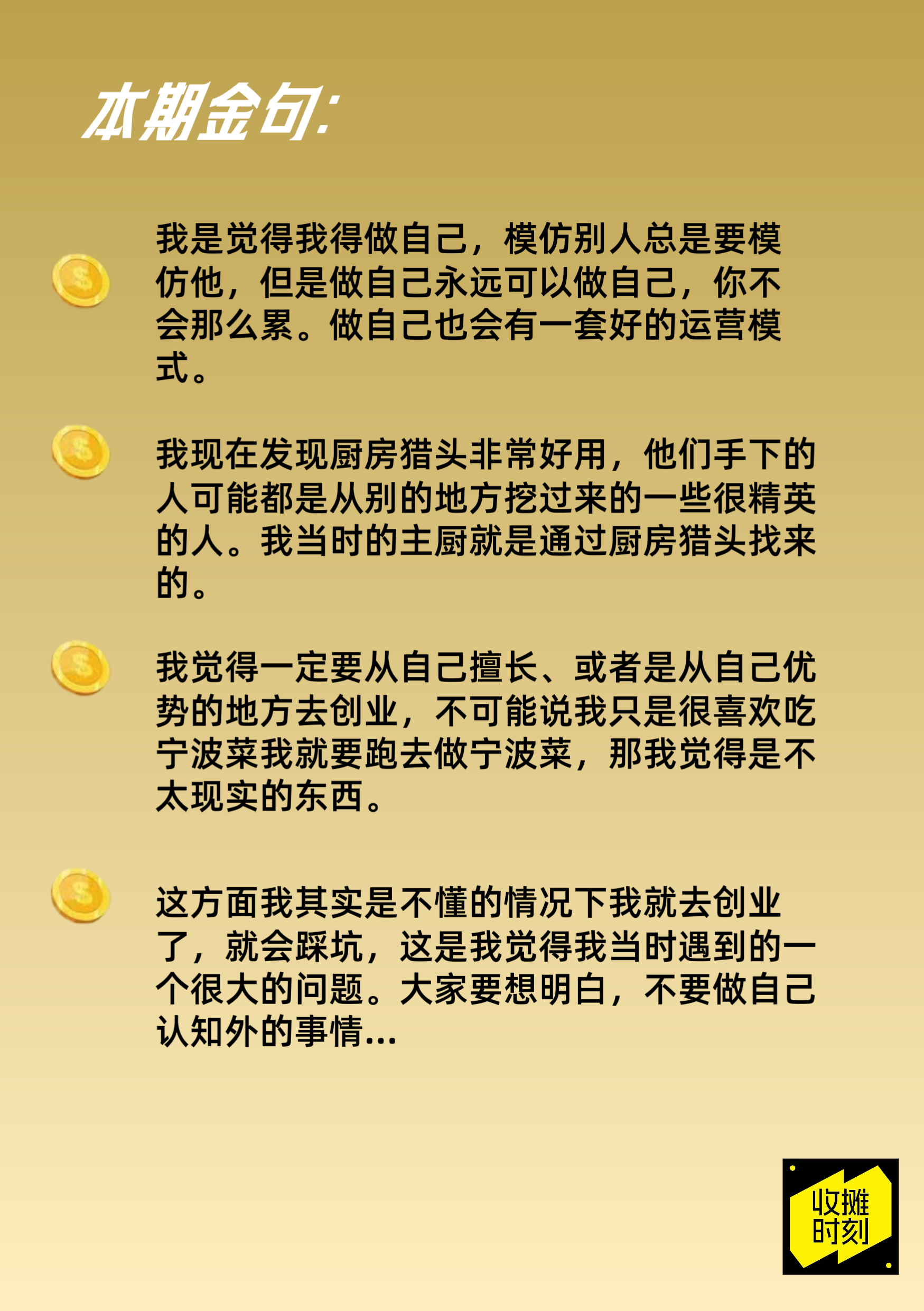 如何用100万启动资金合伙创业,6个月艰难选址;独创“宁波菜+葡萄酒”融合模式,打造差异化竞争力;后厨管理秘籍:巧用厨房猎头招聘,建立家族海鲜直采供应链;三年连开三店的血泪教训:西餐厅亏损20万的认知边界;守店哲学:老板亲力亲为如何让营业额提升30%;精细化运营数据:月营收30万门店的10%净利如何实现;适合所有餐饮创业者、小众品牌主理人收听,看懂如何在自己擅长的领域构建可持续的商业模式。