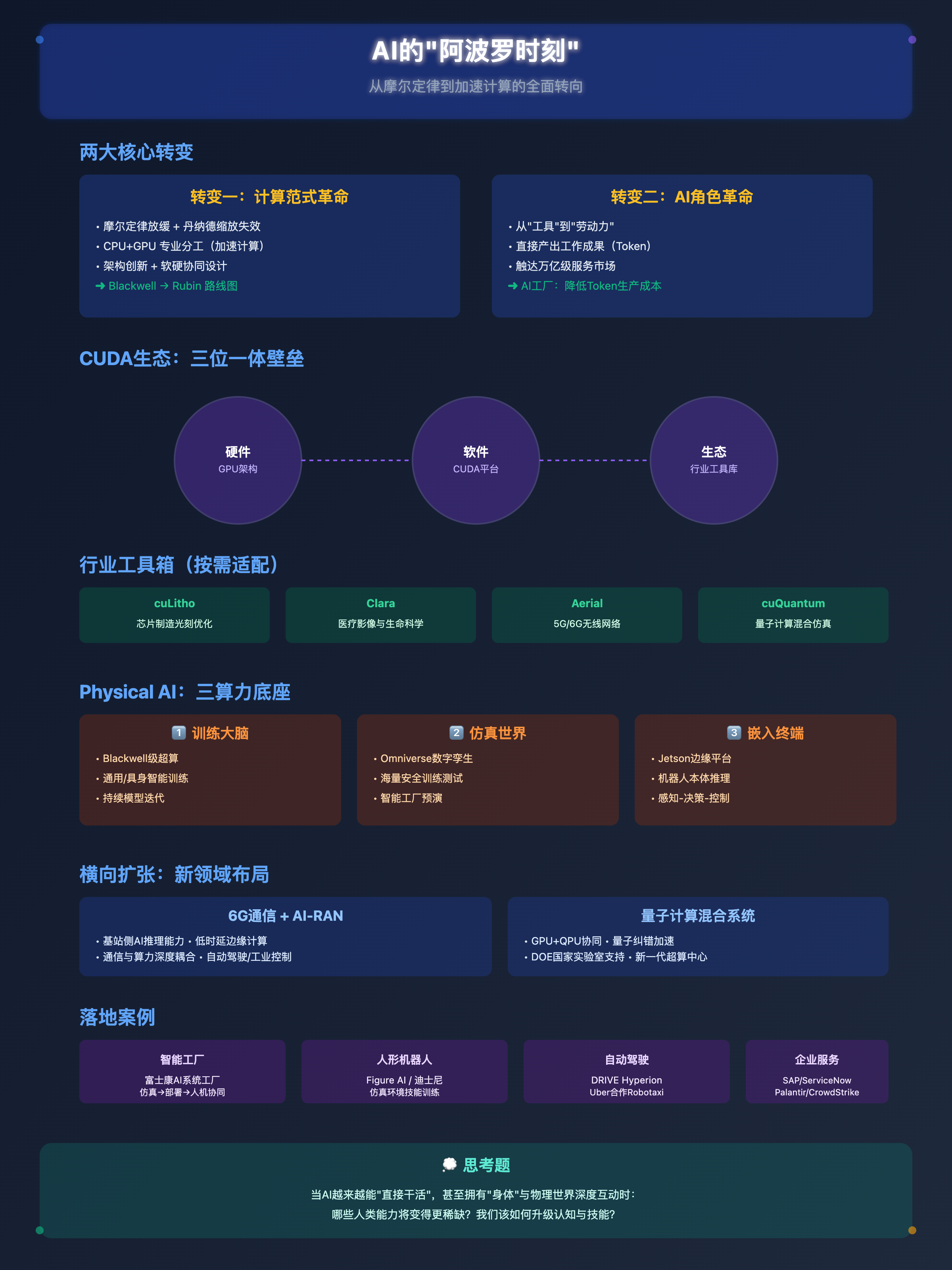 很多人一提 AI,会先想到 ChatGPT 这样的聊天机器人:好玩、能写邮件。但我要说,我们可能正站在一场堪比“阿波罗登月”的技术大变革起点上——人工智能正像水和电一样渗透进通信、科研、医疗、工业制造,甚至影响未来几十年的国家竞争力。听上去像科幻?这正是英伟达近期勾勒的计算未来。今天,我们一起聊聊这场被称为**“新工业革命 / 新计算革命”的核心究竟是什么,它会如何具体影响到你我每个人**。