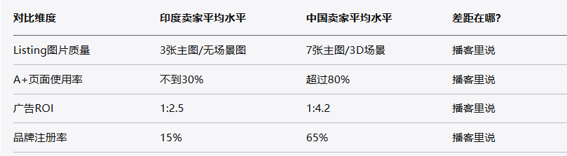 你肯定好奇,印度卖家这么猛,中国卖家还有机会吗?我可以很负责任地告诉你,机会大着呢,而且可能比你想的还要大。我拉了印度TOP100卖家的Listing数据做对比分析,发现了3个他们完全做不好的地方:产品图片优化、A+页面设计、广告投放精准度。这三个维度上,印度卖家的平均水平只有中国卖家的60%左右。换句话说,他们现在还处在"有货就能卖"的粗放阶段,精细化运营根本跟不上。想知道具体怎么利用这个窗口期?听完这期你就懂了,我会告诉你哪些品类现在切入最合适。