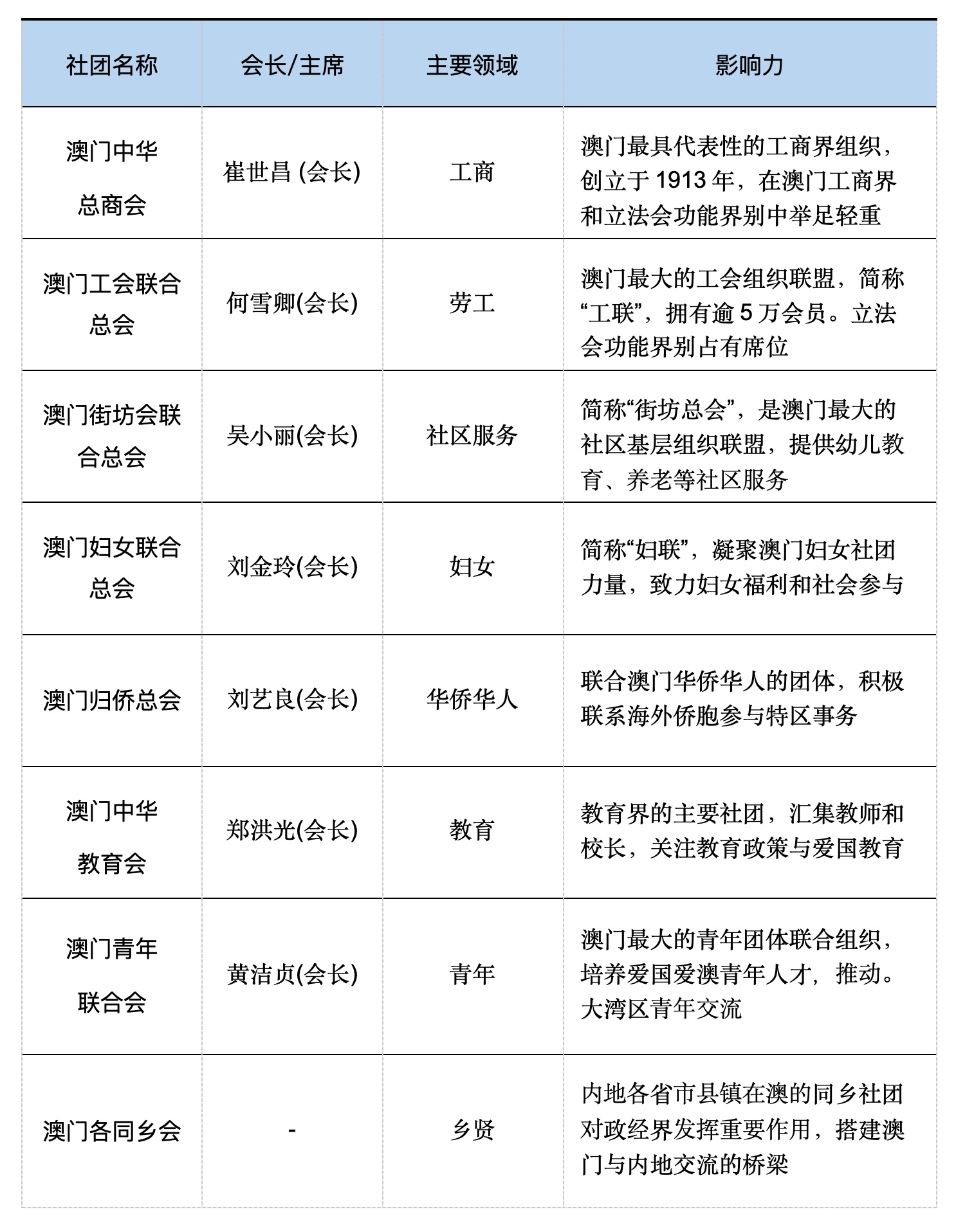 - 港澳有影响力的社团可以通过功能界别推选立法会议员,从而更加深入参与政策制定、政府决策和社会治理。