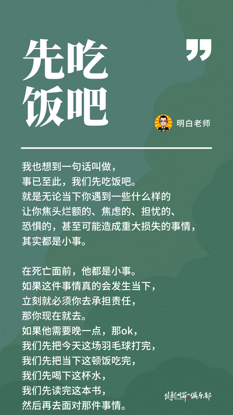 我也想到一句话叫做,事已至此,我们先吃饭吧。就是无论当下你遇到一些什么样的让你焦头烂额的、焦虑的、担忧的、恐惧的,甚至可能造成重大损失的事情,其实都是小事。在死亡面前,他都是小事。