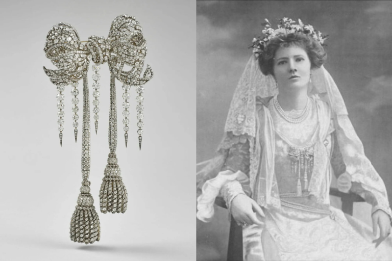 Westminster 公爵女兒為 Lady Lettice Grosvenor 的婚禮時購入,並在拍攝時以胸針配上婚紗並拍下婚照。(1902年)