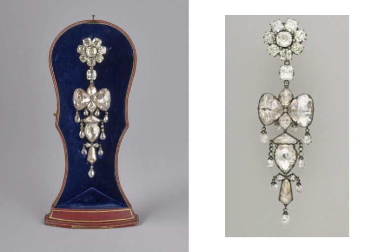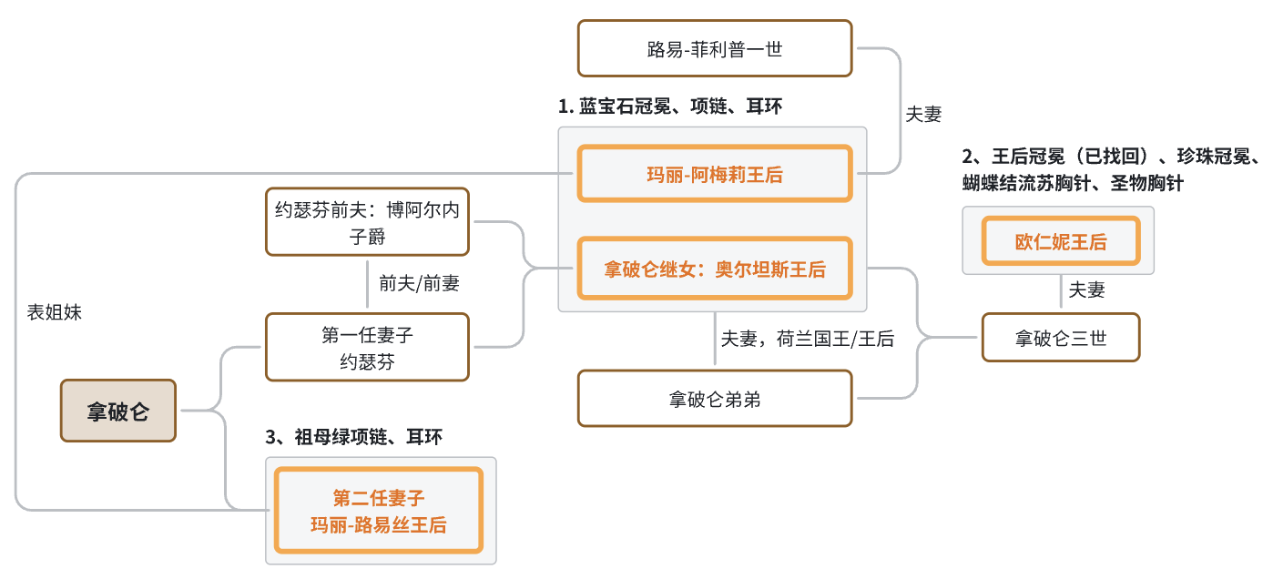 - 欧仁妮王后(Eugénie de Montijo,1826–1920):王后冠冕(已找回)、珍珠冠冕、蝴蝶结流苏胸针、圣物胸针