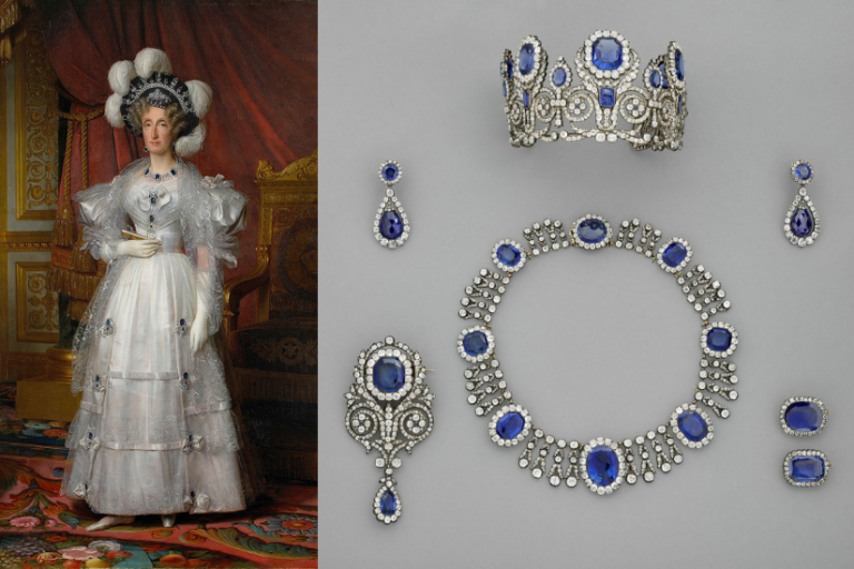 - 奥尔坦斯王后(Hortense de Beauharnais,1783–1837)与玛丽-阿梅莉王后(Marie-Amélie de Bourbon-Siciles,1782–1866):蓝宝石冠冕、蓝宝石项链、蓝宝石耳环 套件