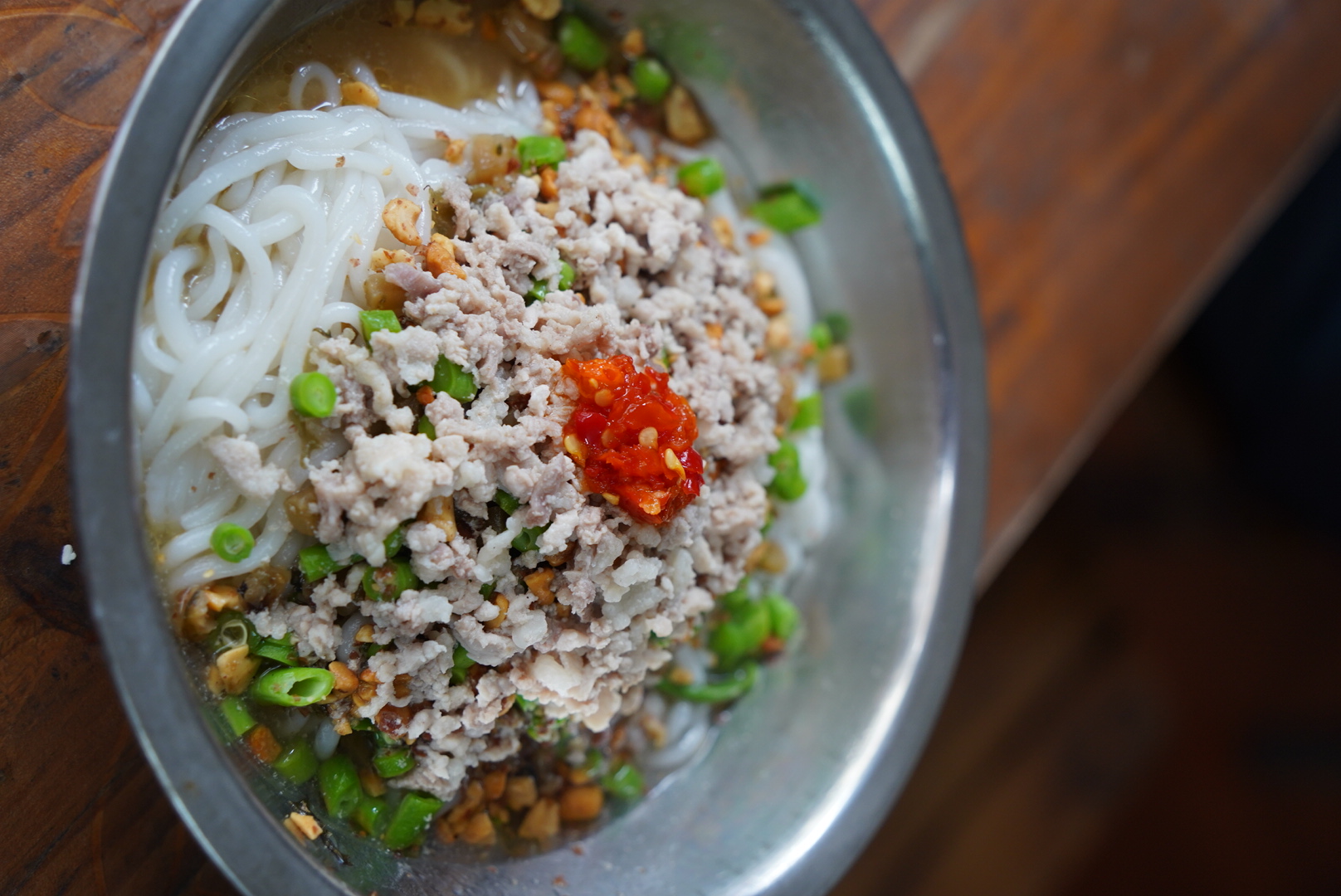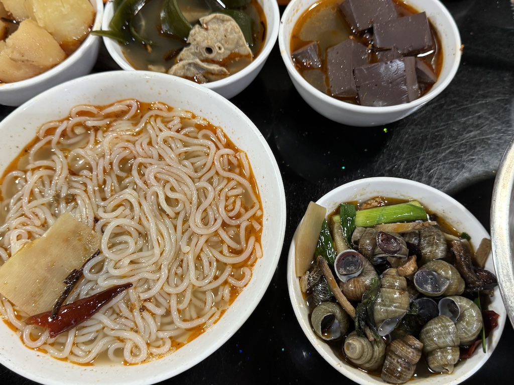 新吃到哪些粉呢?螺蛳粉一开始的模样——粉汤分离版本;在一个小镇上吃到无名粉店、当地热门的滑滑粉,现做榨粉的全州红油米粉与融安滤粉、广西生榨粉。