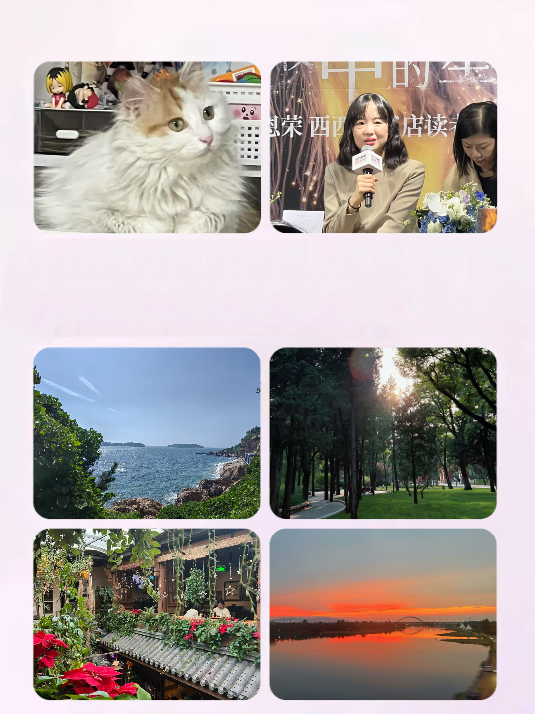 *从上至下、从左至右依次为:超可以养的喵、崔恩荣见面会、鲸鱼在大连海边、日坛公园、生日餐厅、正定返程途中的落日余晖