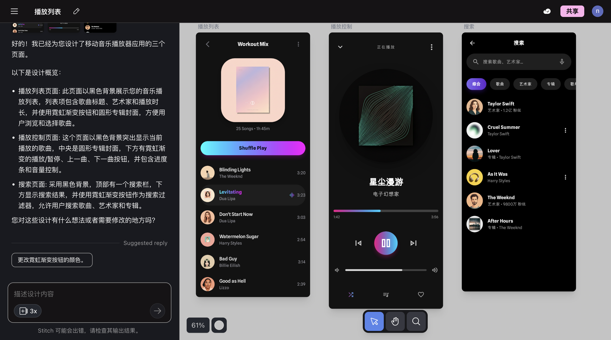 没有设计基础,也能做出专业原型?这次让我们深度体验Google全新AI设计工具Stitch,直接用一句话生成电商站、音乐App界面,还能导入Figma继续优化。本期分享真实测试、优缺点与使用技巧,让开发者和创业者都能用AI快速搭建产品原型!电商网站:音乐播放器App: