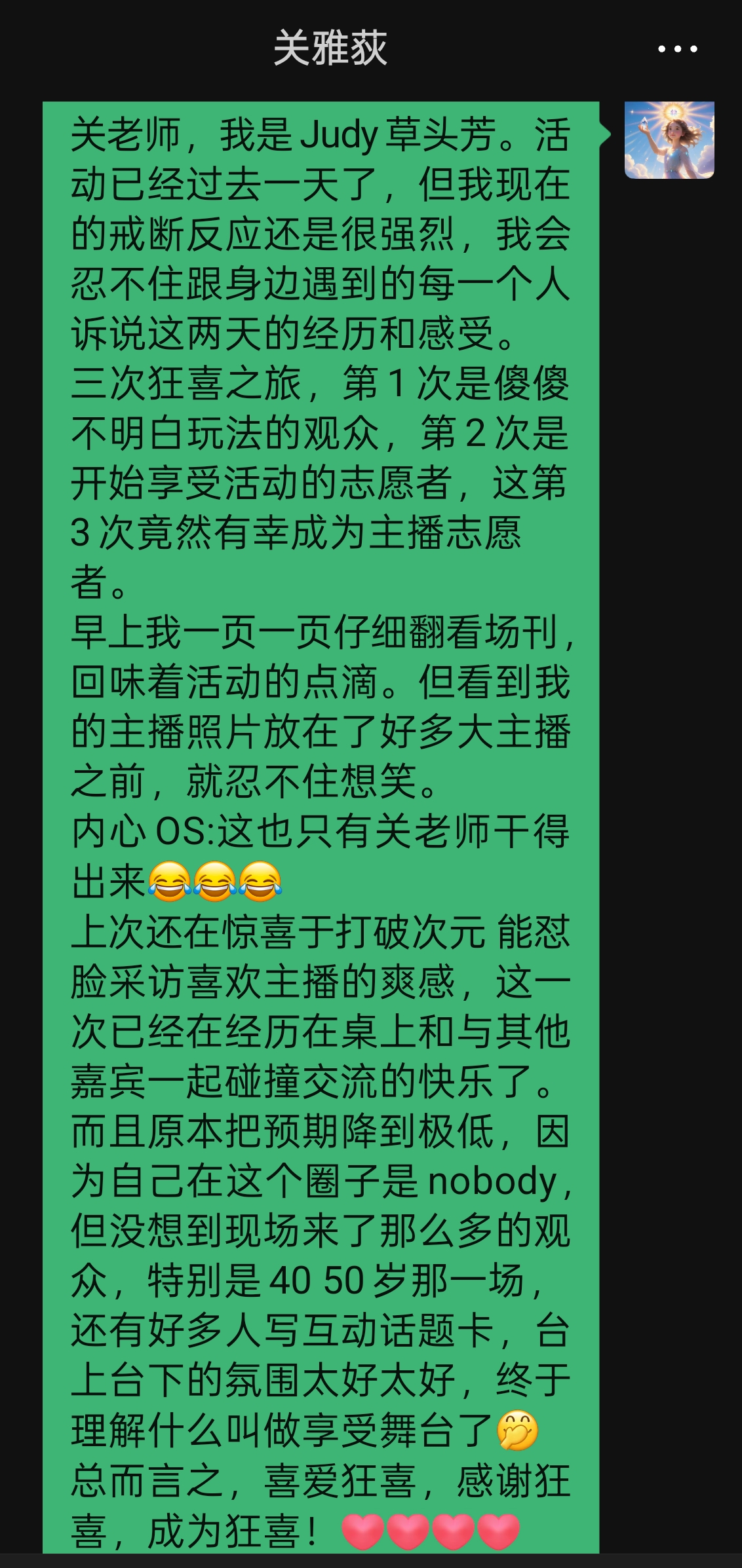 晚上我刚发了这么一段话给活动创办人关雅荻老师