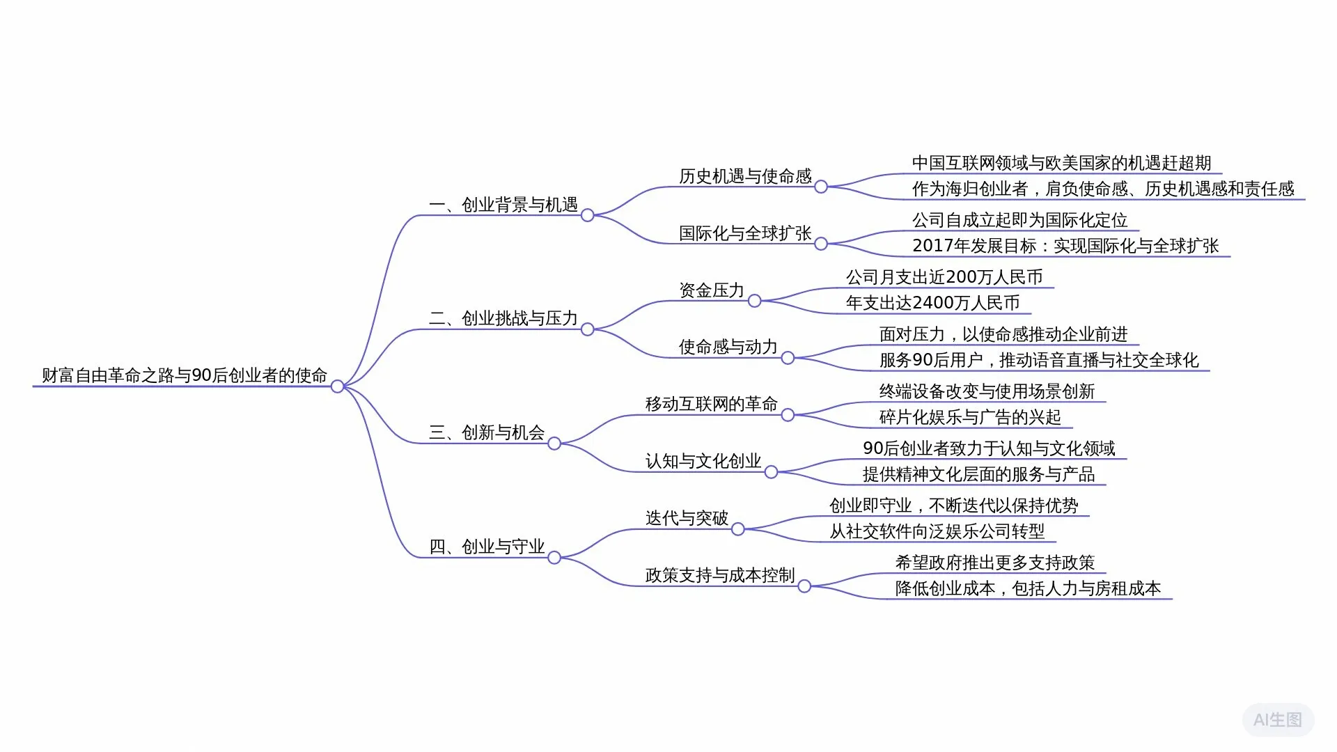 - 90后(做认知):当90后创业时,“绝大多数的互联网基础设施已经被建好了”。因此,90后的“主要努力的目标”是**“做认知”**(“包括我做娱乐,做文化,其实就是一个做认知的...范畴”)。