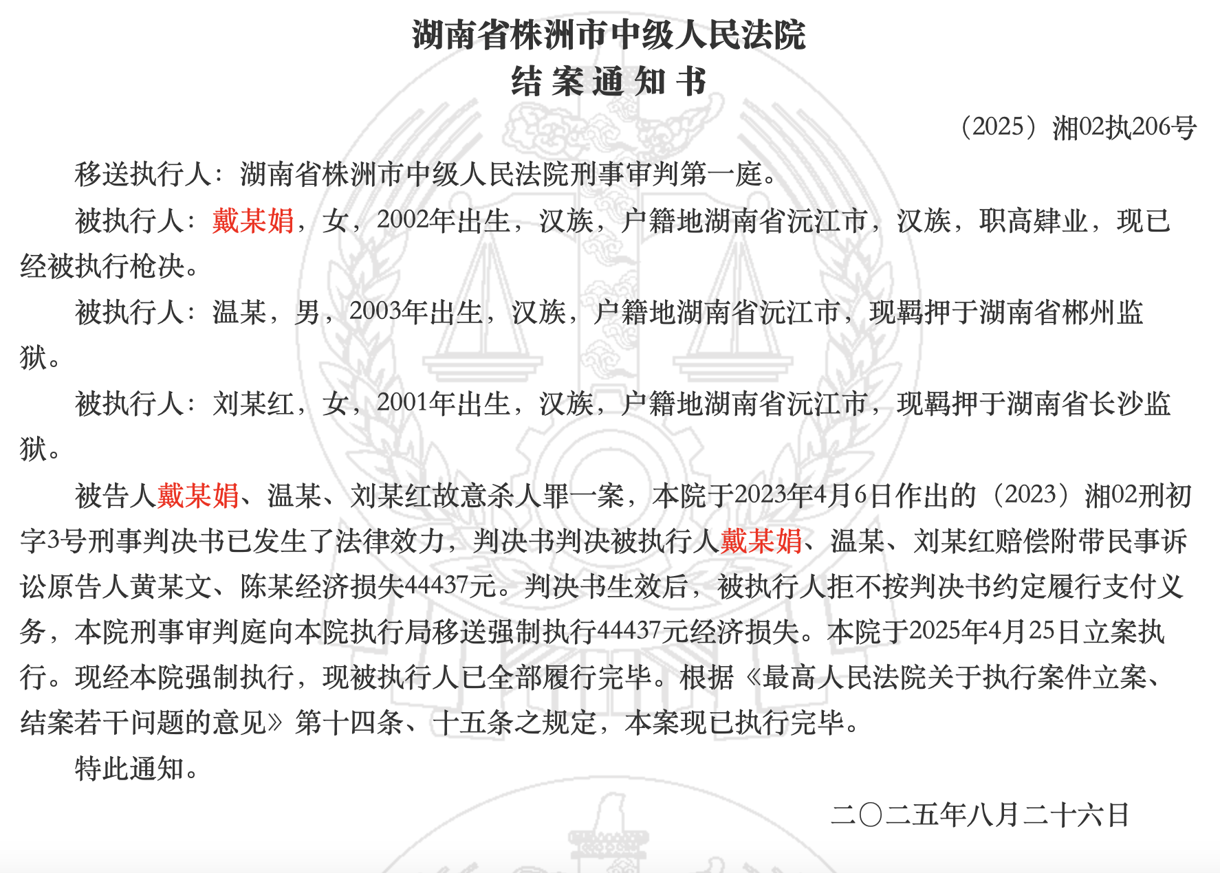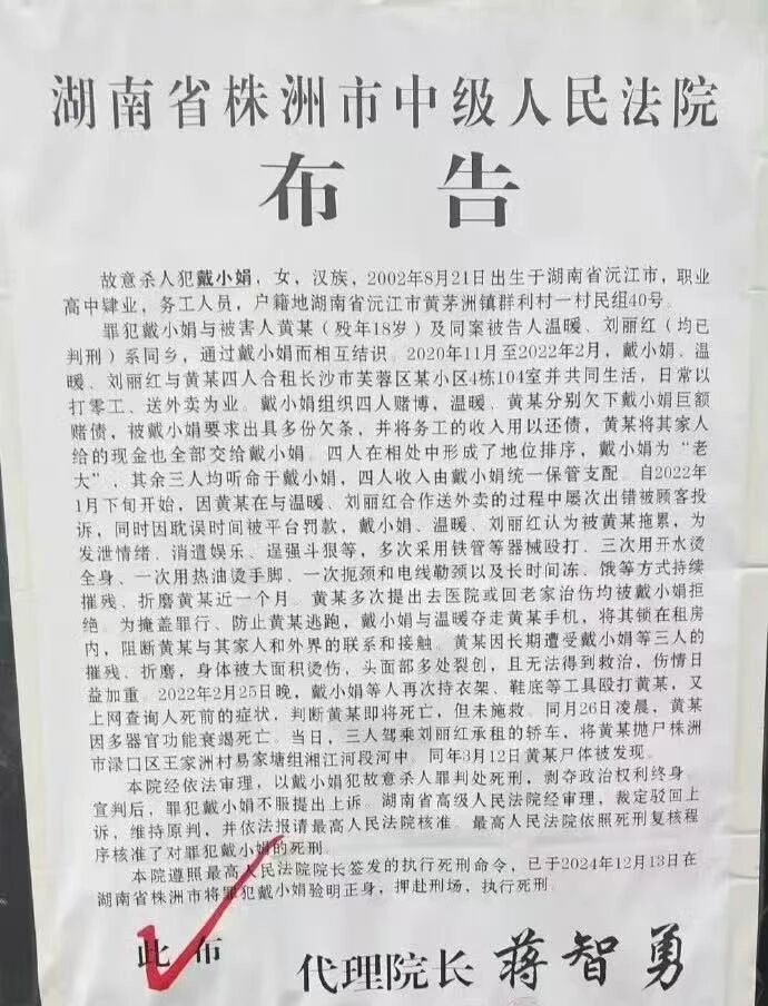 2024年12月13日,湖南省株洲市中级人民法院将2002年出生的戴小娟验明正身,押赴刑场,执行死刑。