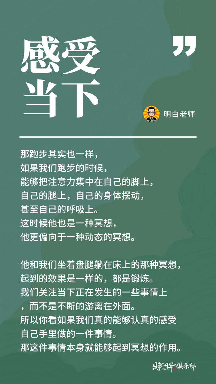 那跑步其实也一样。如果我们跑步的时候,能够把注意力集中在自己的脚上,自己的腿上,自己的身体摆动,甚至自己的呼吸上。这时候他也是一种冥想,他更偏向于一种动态的冥想。