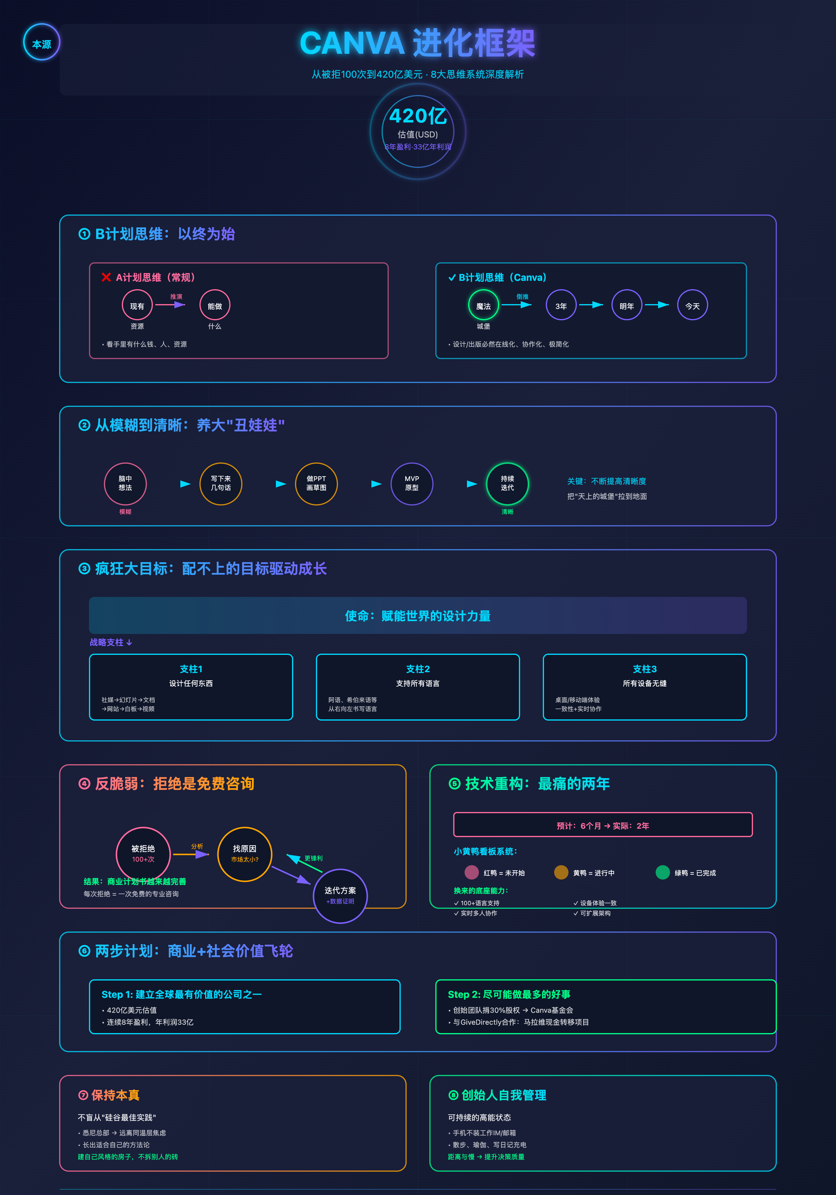 放在 Canva 上:如果用 A 计划看,Perkins 当时只是大学生,没经验、没团队、没钱——大概率什么也做不成。可她的 B 计划非常坚定:未来的设计与出版一定会在线化、多人协作、极简易用。技术与商业模式细节尚未明确,但“魔法城堡”已经在心中树立。