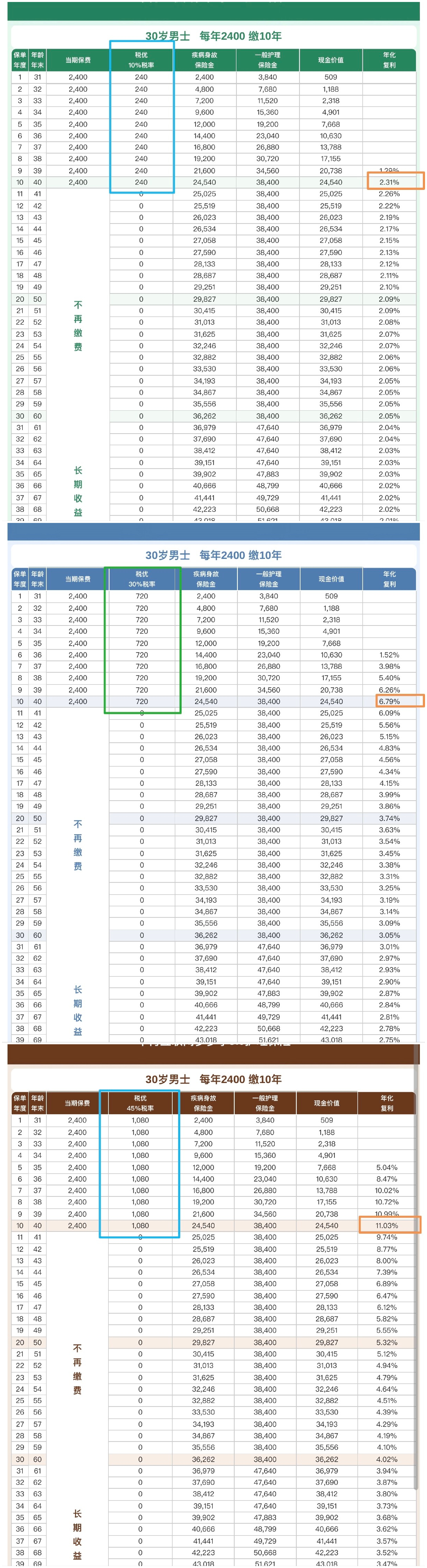 - 税优护理险的利益演示表可以清晰地看到不同税率下的现金价值和回报情况