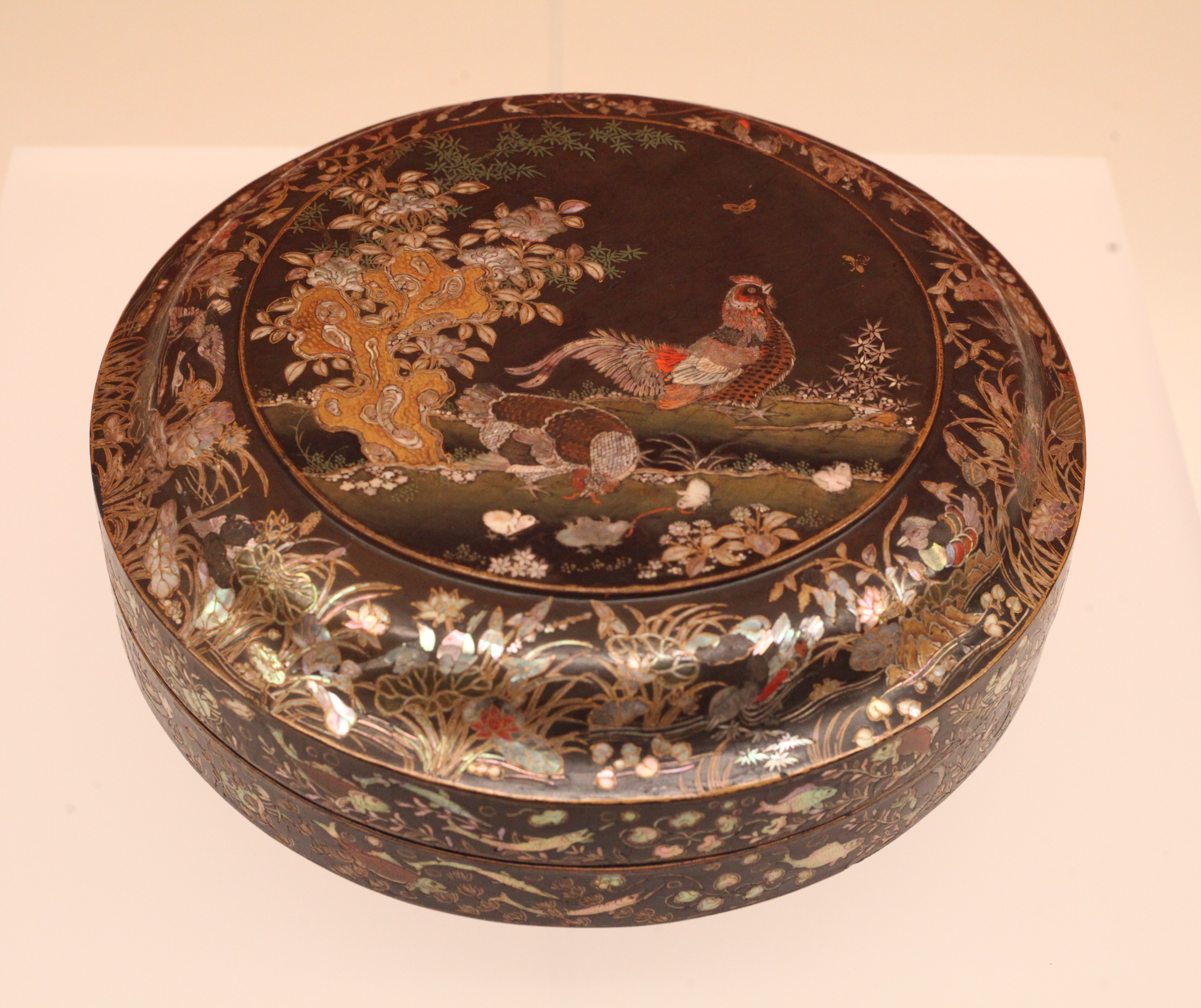 黑漆螺钿描金锦鸡花蝶图圆盒,南宋至元13-14世纪,福冈市立美术馆藏