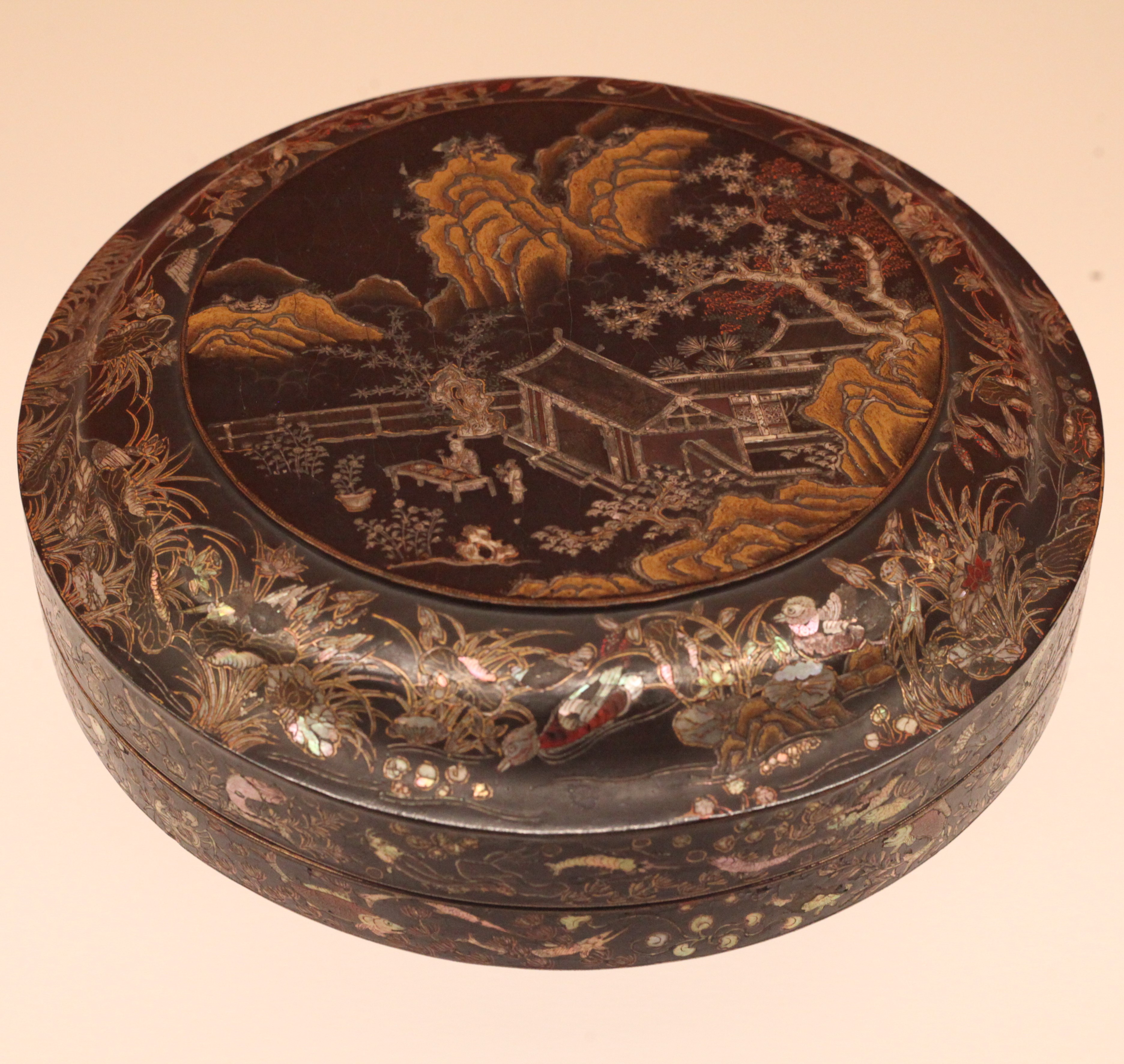 黑漆螺钿描金山水人物图圆盒,南宋至元13-14世纪,东京国立博物馆藏