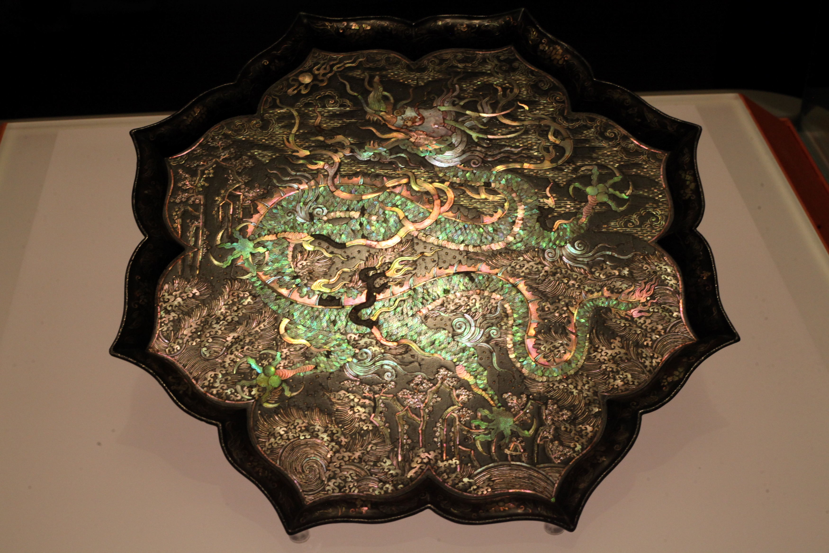 黑漆螺钿海水龙纹菱花形盘,元14世纪,东京国立博物馆藏